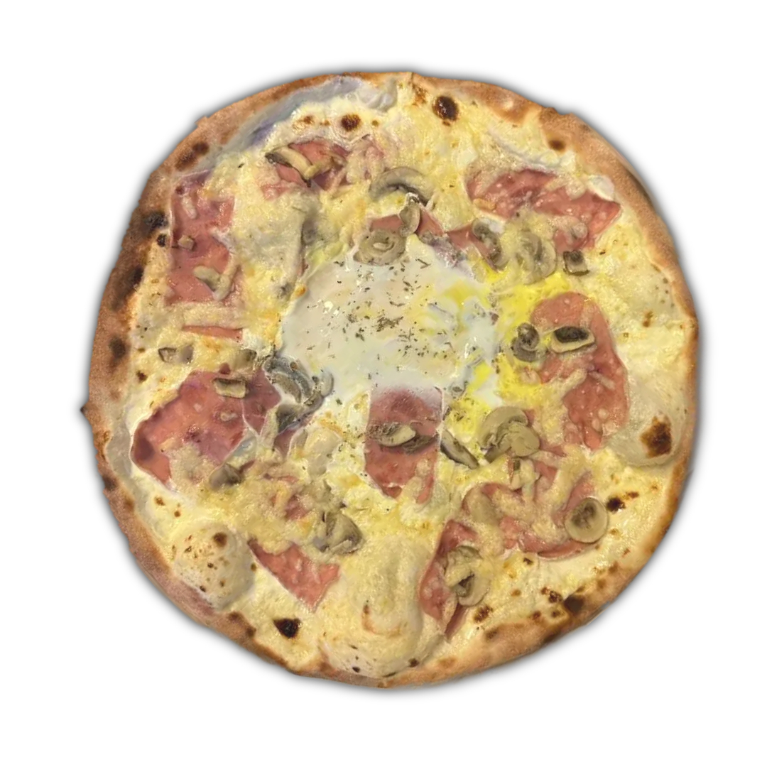 mit Carbonarasauce, Schinken, Champignon, Spiegelei und Parmesan